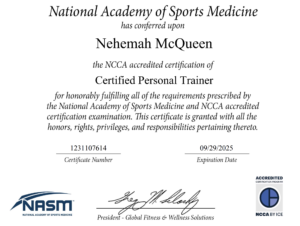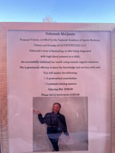 Nehemah McQueen- Fitness trainer (offers 3 personal training sessions and one consultation)